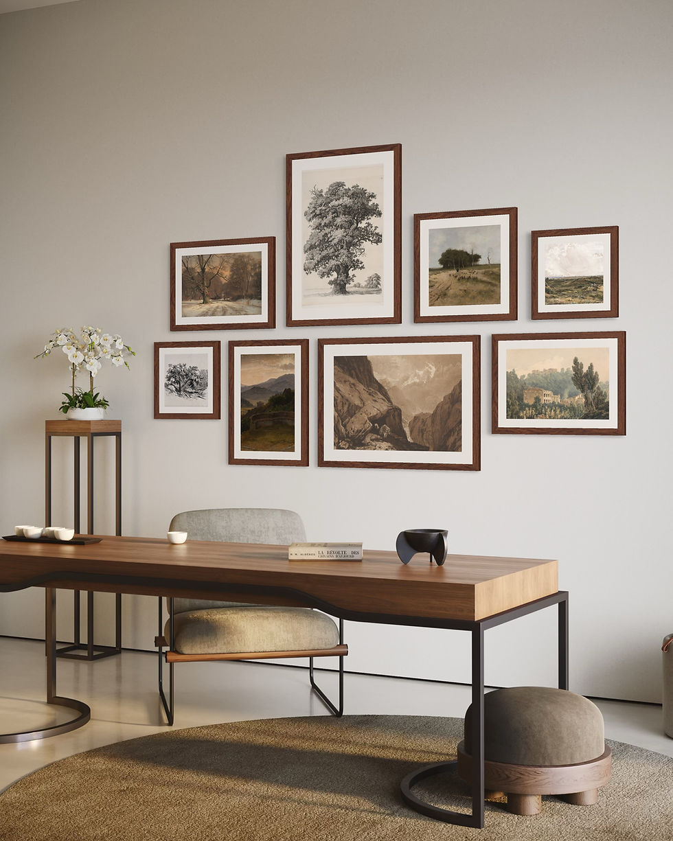 Set posterler, tek bir poster seçmek yerine duvarda birlikte çalışan görsellerden oluşan düzenli bir kompozisyon kurmak isteyenler için tasarlanır. Galeri duvarı etkisi; tema, ton ve form bütünlüğüyle daha “tam” görünür ve mekâna net bir karakter kazandırır.